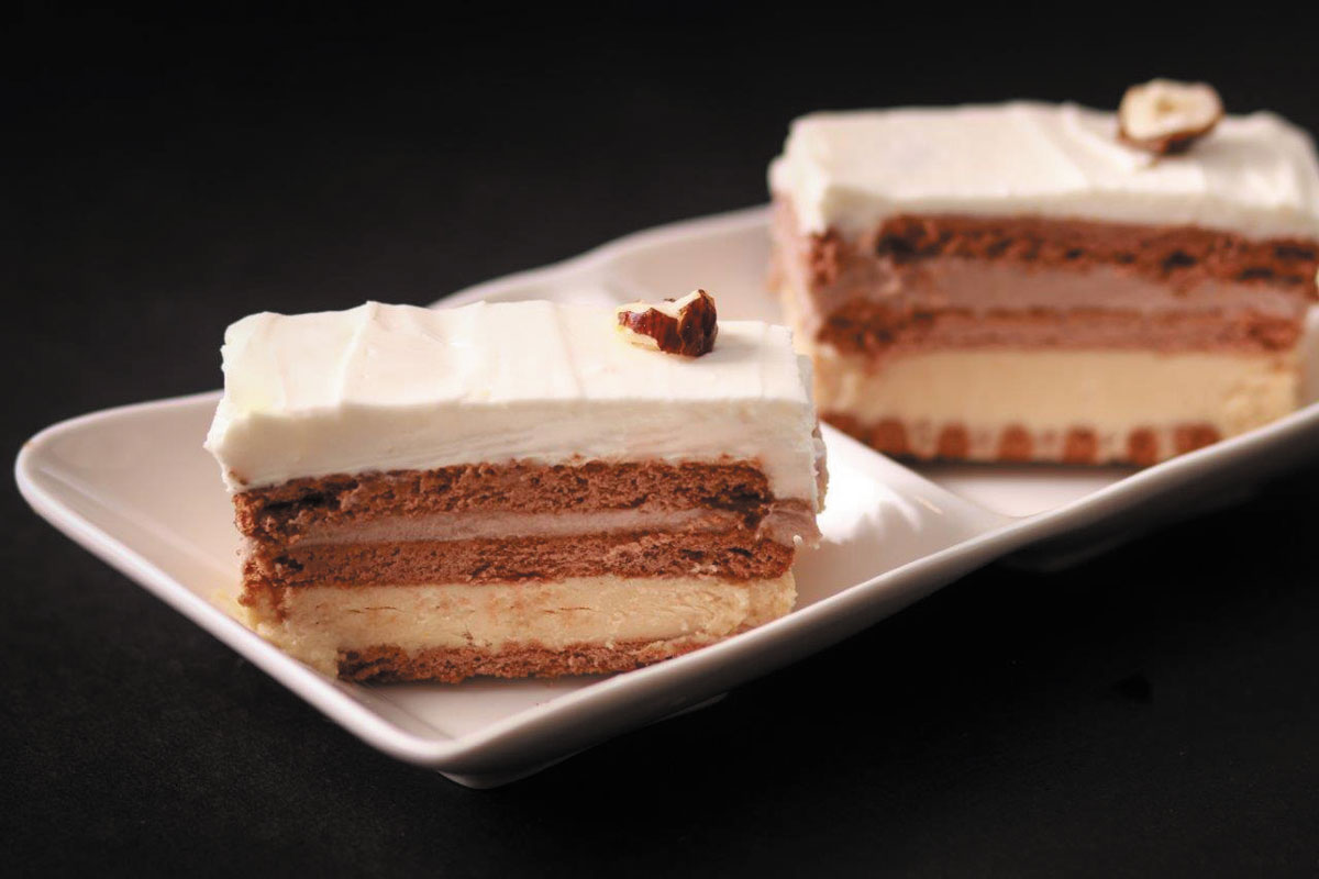 4. מרכיבים את העוגה: מניחים בשתי תבניות אינגליש קייק מרופדות בנייר אפייה שכבה של ביסקוויטים. יוצקים מלית חמאת בוטנים בשתי התבניות. מניחים שכבה נוספת של ביסקוויטים, ועליהן יוצקים מלית של גבינת נוגט. מניחים שכבת ביסקוויטים נוספת ומורחים מעליה באופן נאה מלית שוקולד לבן. שומרים במקרר שמונה שעות או שעתיים בהקפאה עד להגשה.